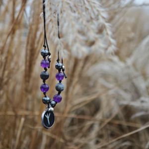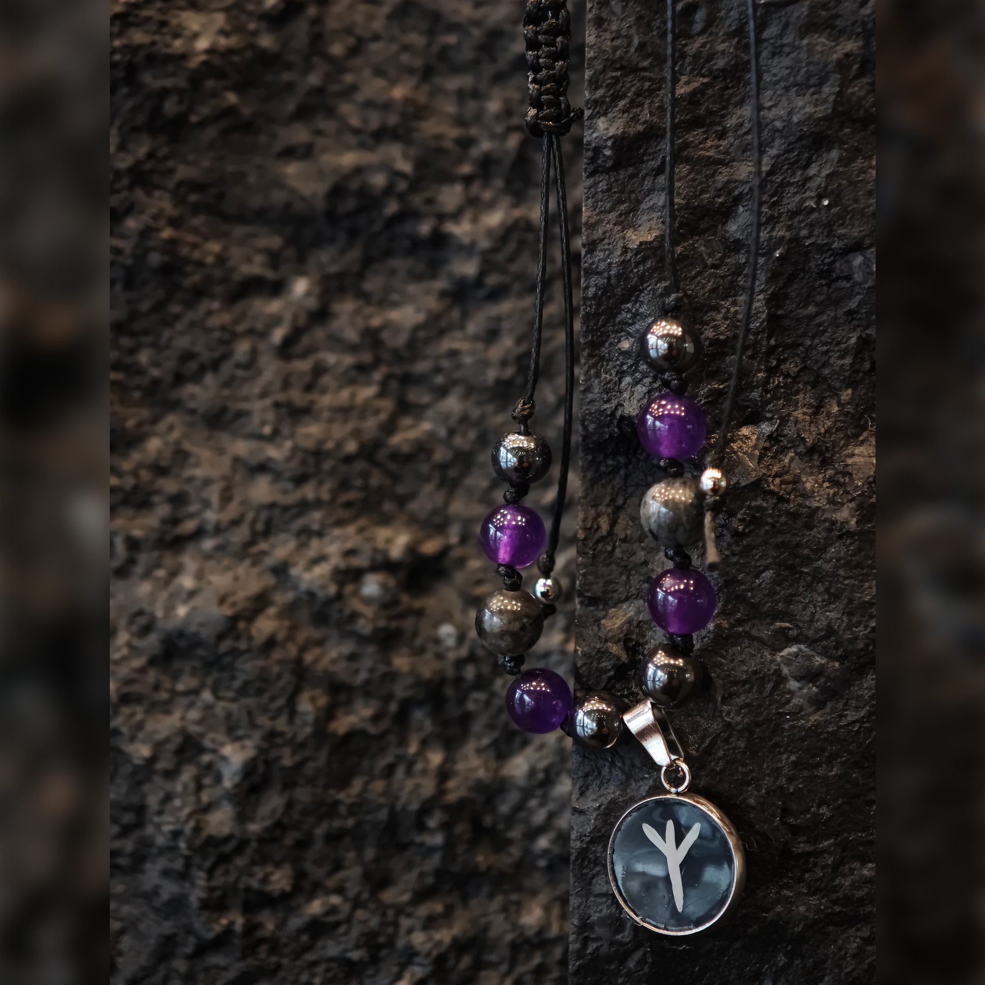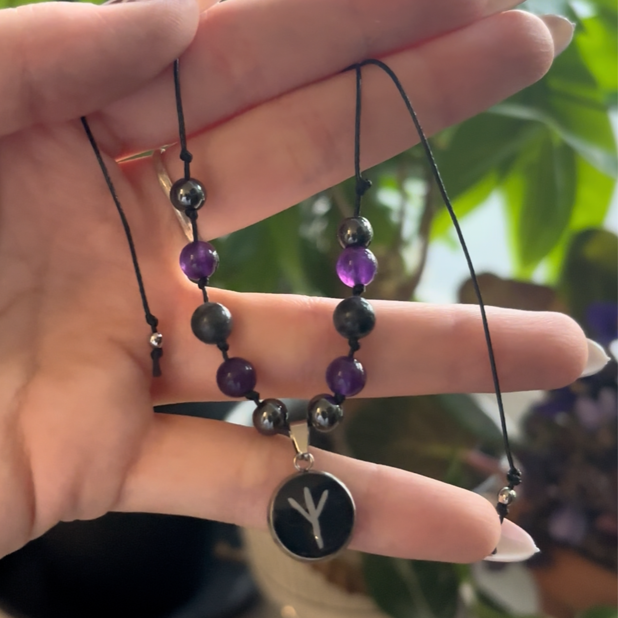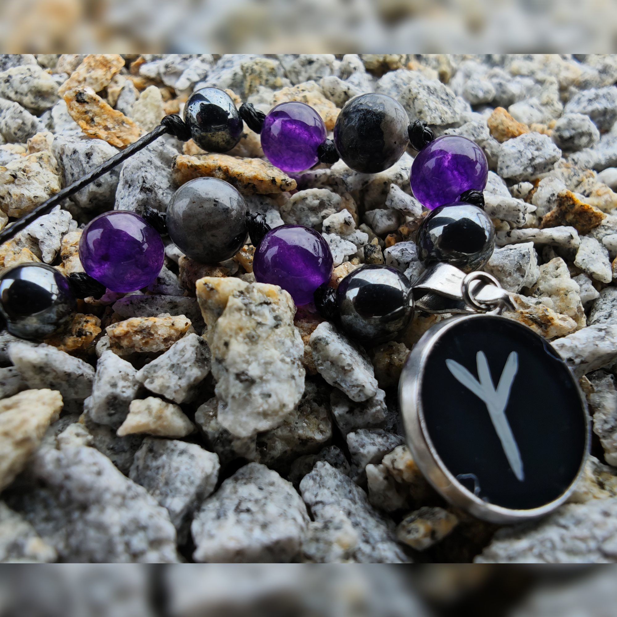 ✔️ Materiały: Starannie dobrane kamienie naturalne (larvikit zwany czarnym labradorytem, hematyt, ametyst), wytrzymały sznurek, ręcznie malowana zawieszka z runą Algiz
