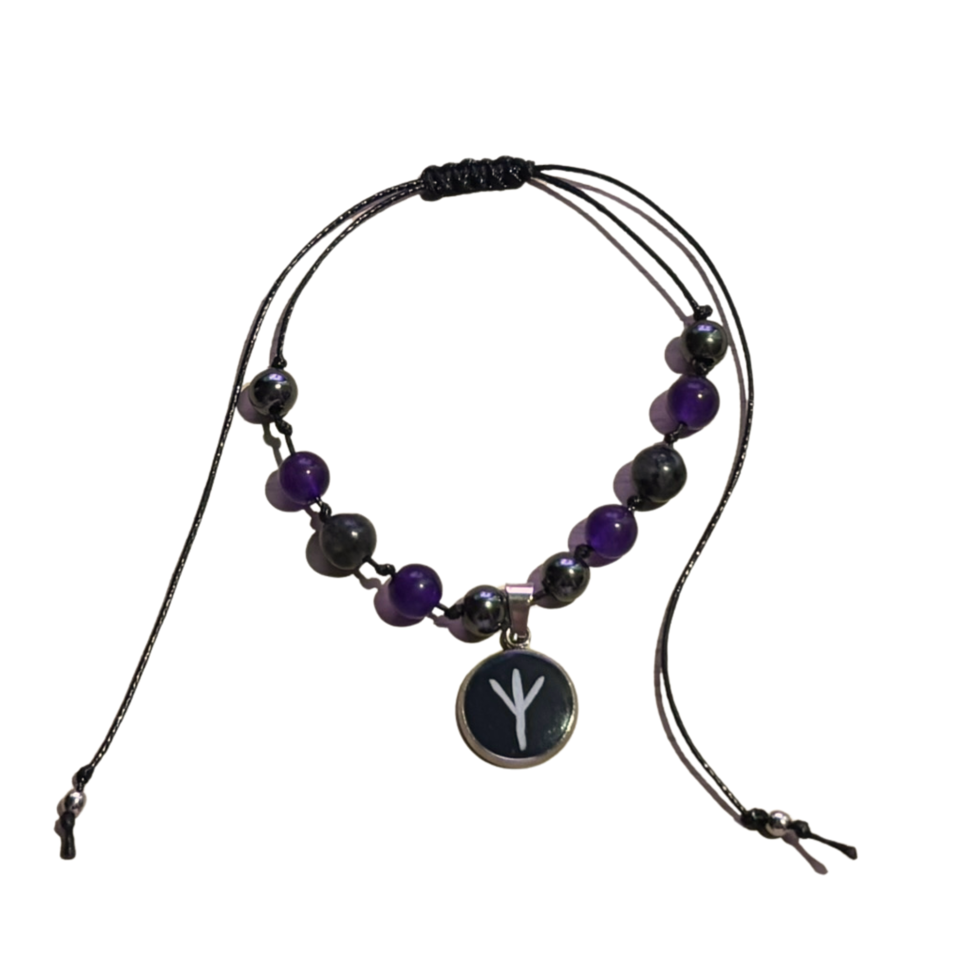 Bransoletka z runą Algiz | larvikit, hematyt, ametyst, naturalne