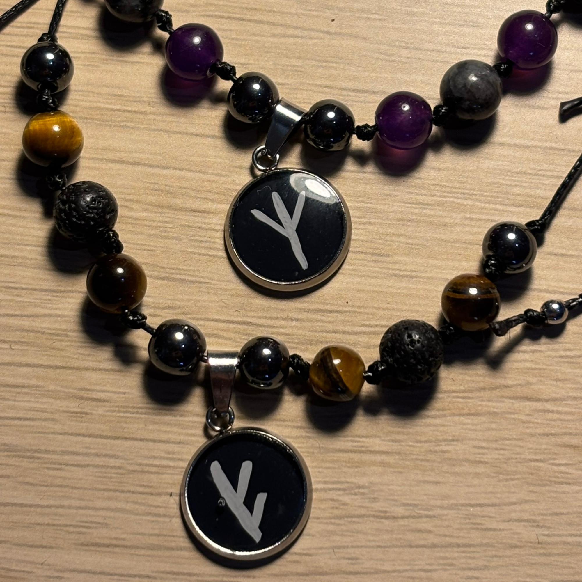 Bransoletka z runą Algiz, ręcznie wykonana ze sznurka i naturalnych kamieni. Symbol ochrony wojownika i siły Północy, inspirowany nordyckimi tradycjami.