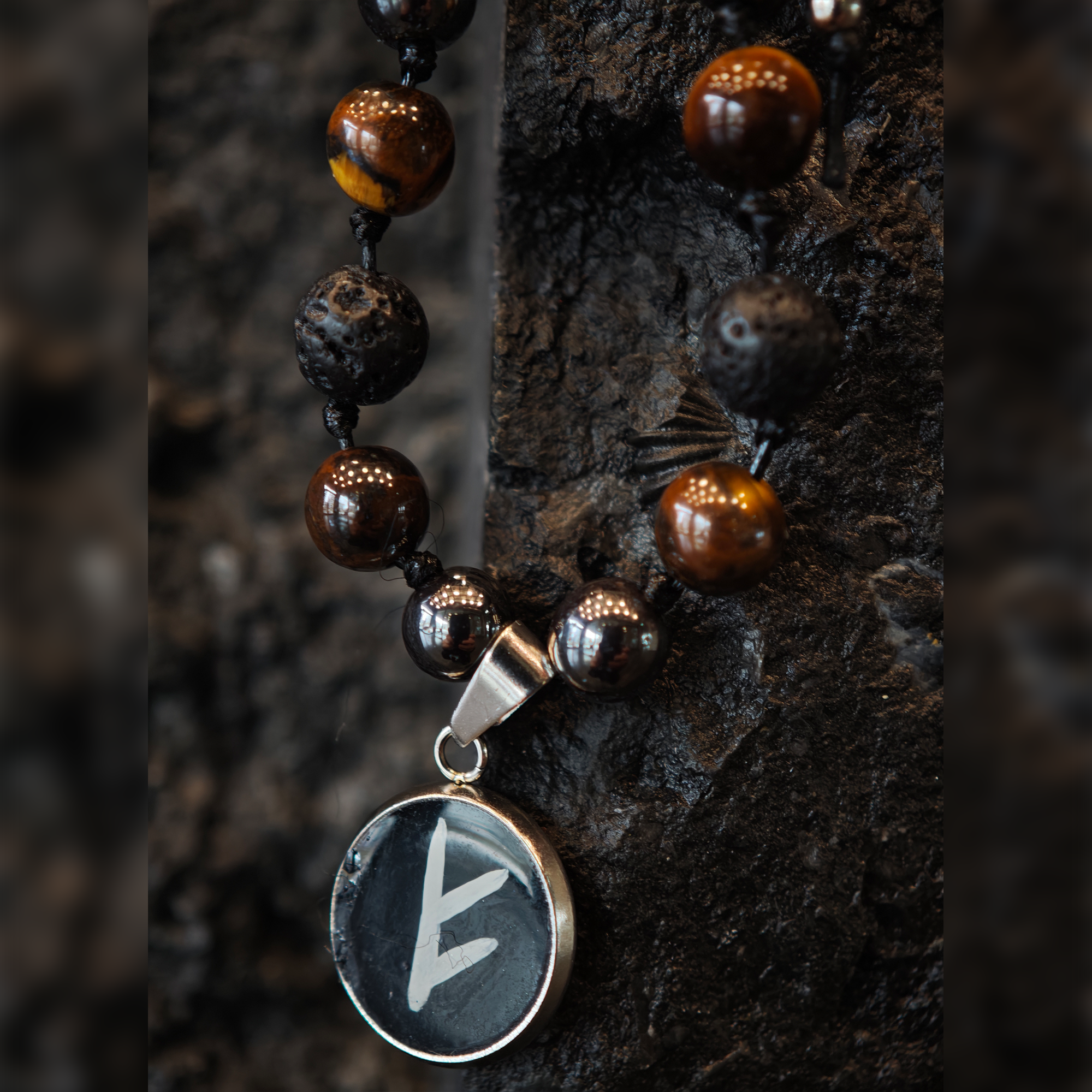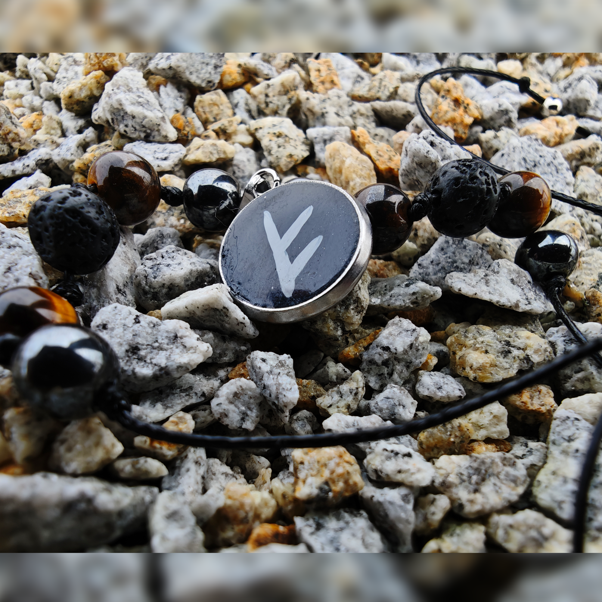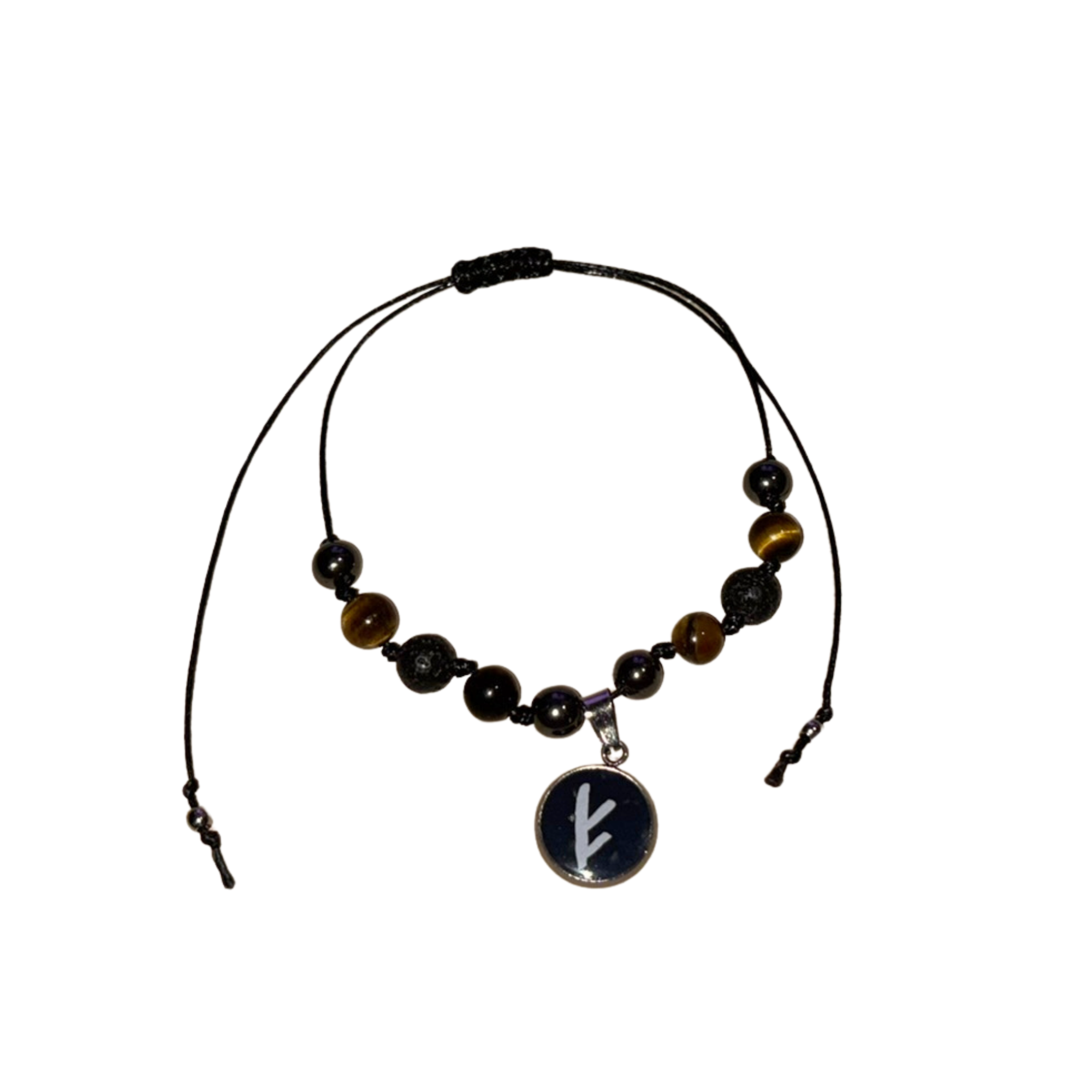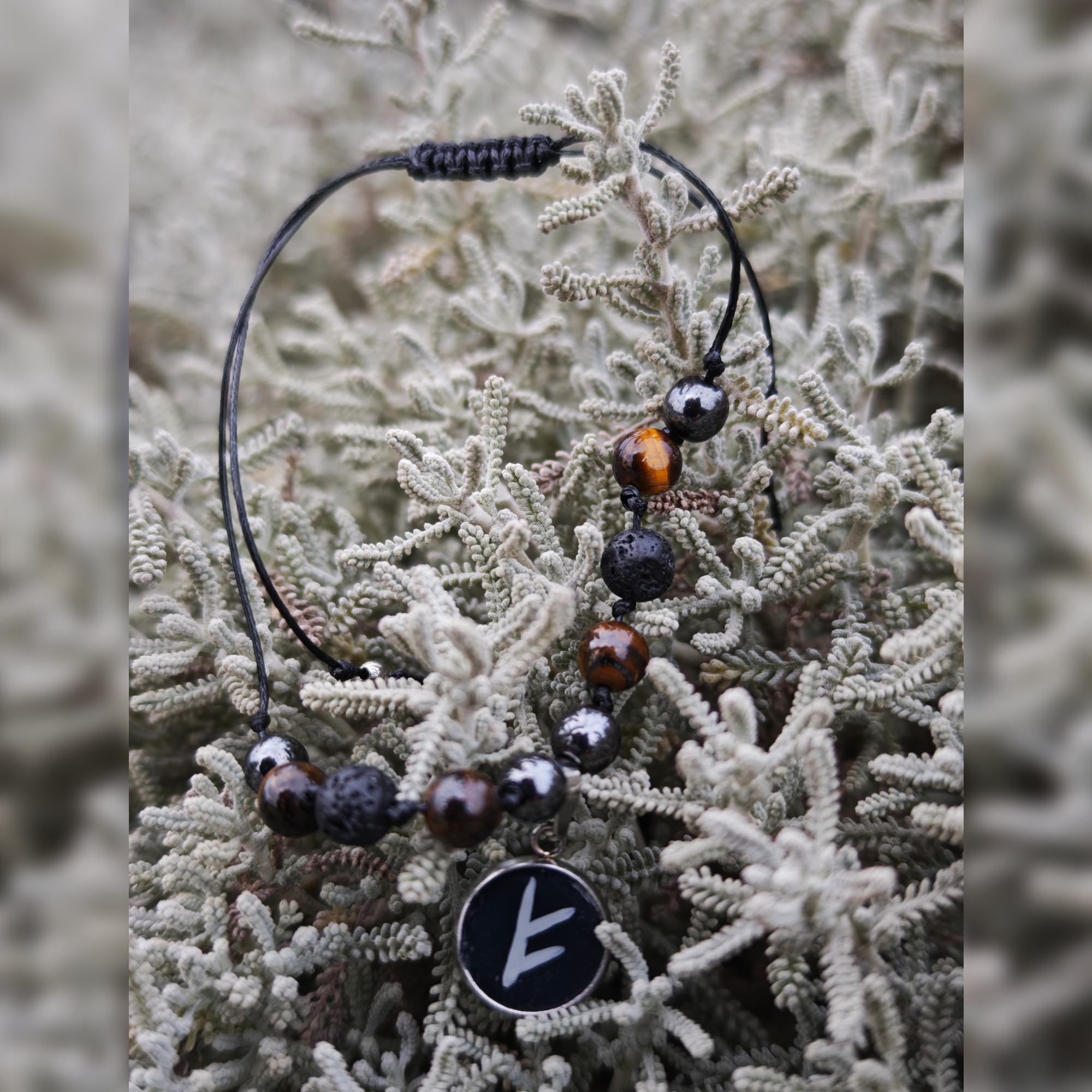 Ręcznie wykonana bransoletka z runą Fehu i naturalnych kamieni – hematytu, tygrysiego oka oraz kamienia wulkanicznego. Symbol pomyślności i energii do działania, znany również jako runa na pieniądze i dobrobyt.
