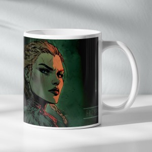 ✔️ Elegancki design: Kubek zdobiony subtelnymi motywami inspirowanymi Freyą – drapieżny kot i symbole magii, które podkreślają jej wyjątkowy charakter.