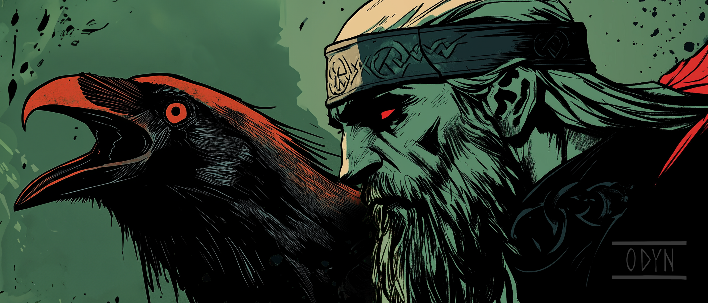 ✔️ Symboliczny design: Grafika przedstawia Odyna w jego majestatycznej postaci, z jednym okiem oraz krukiem Huginnem, symbolizującym myśl i pamięć.